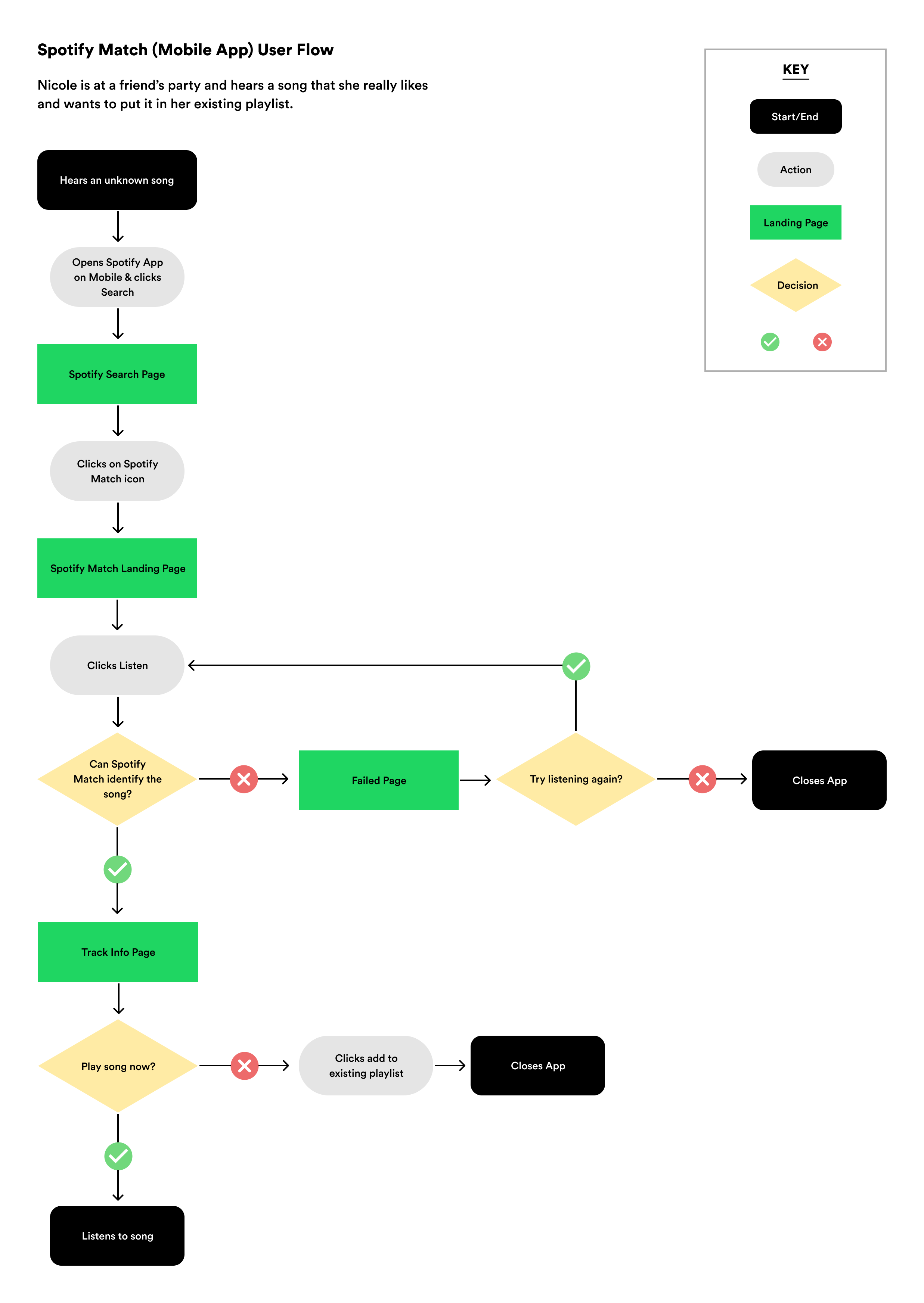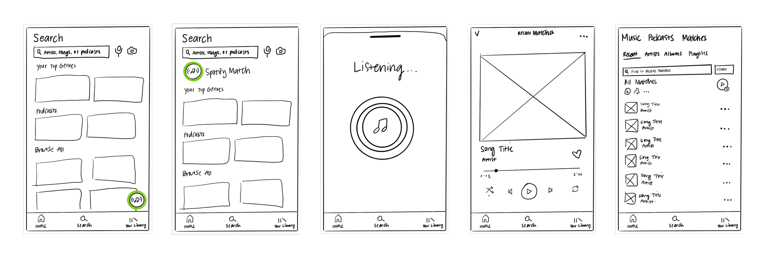 After forming research findings, personas, and IA, I began brainstorming how to integrate the new Spotify Match feature seamlessly within the existing mobile app. This led to creating sketches and the mid-fidelity wireframes for usability testing. Using Spotify’s Design Guidelines, I wanted to incorporate the color palette, flow, and new feature logo to be intuitive and to be respectful to Spotify’s brand restrictions while keeping the familiar user experience.