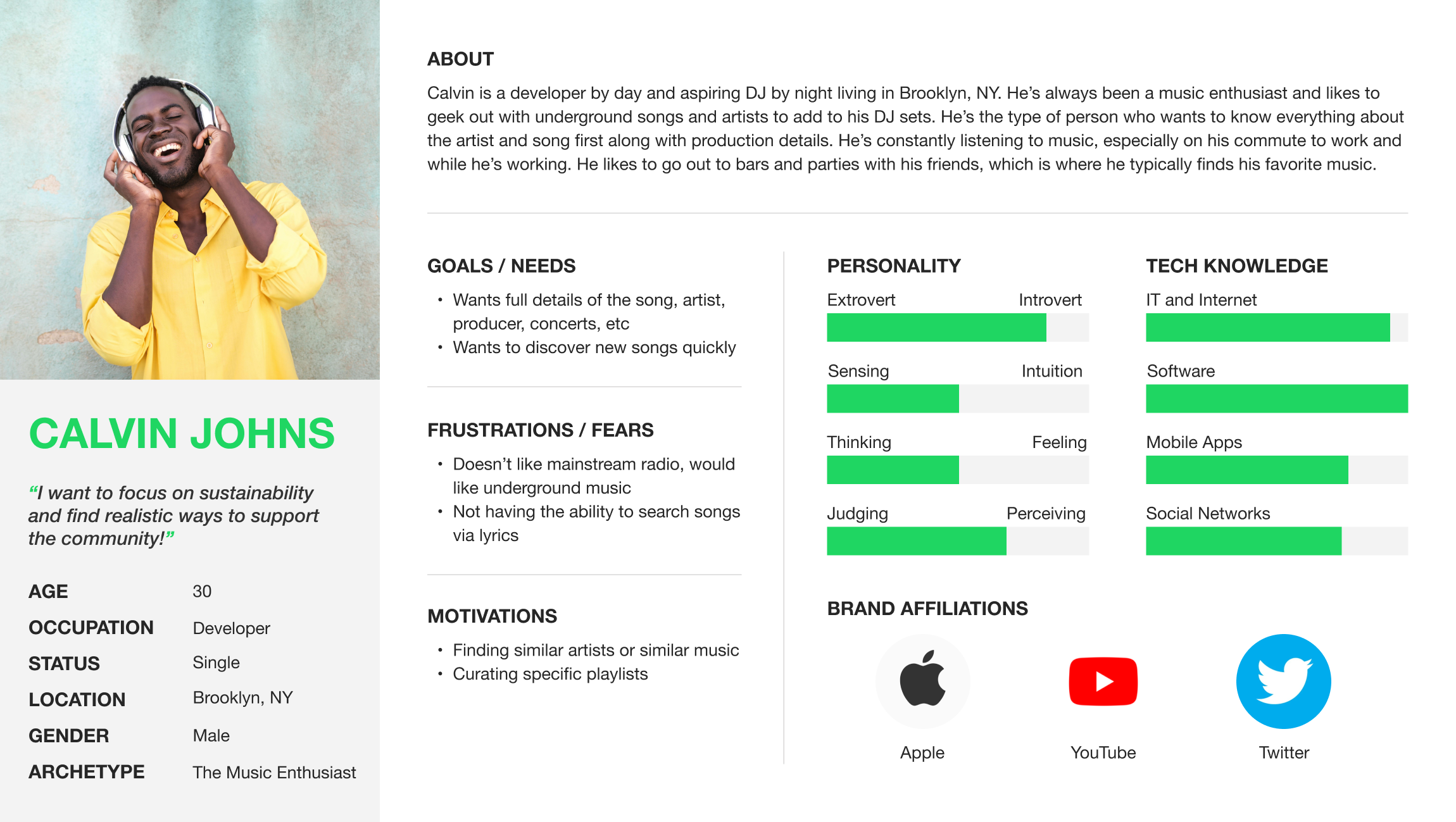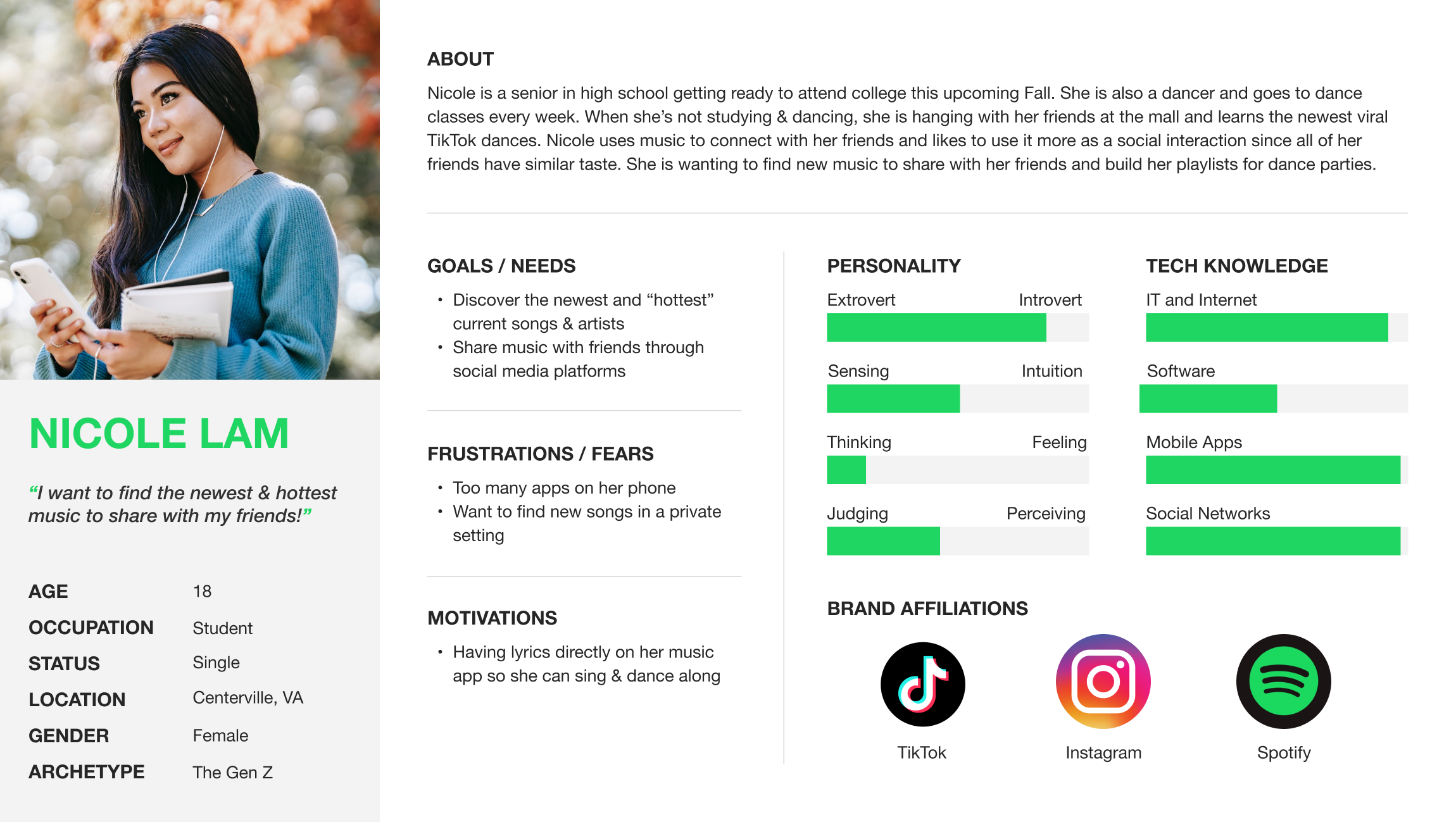 Based on user interviews and secondary research, personas were created to represent Spotify Match’s target audience. Having personas allowed me to communicate and empathize with the customer’s needs while guiding me with the decision-making throughout the project scope.