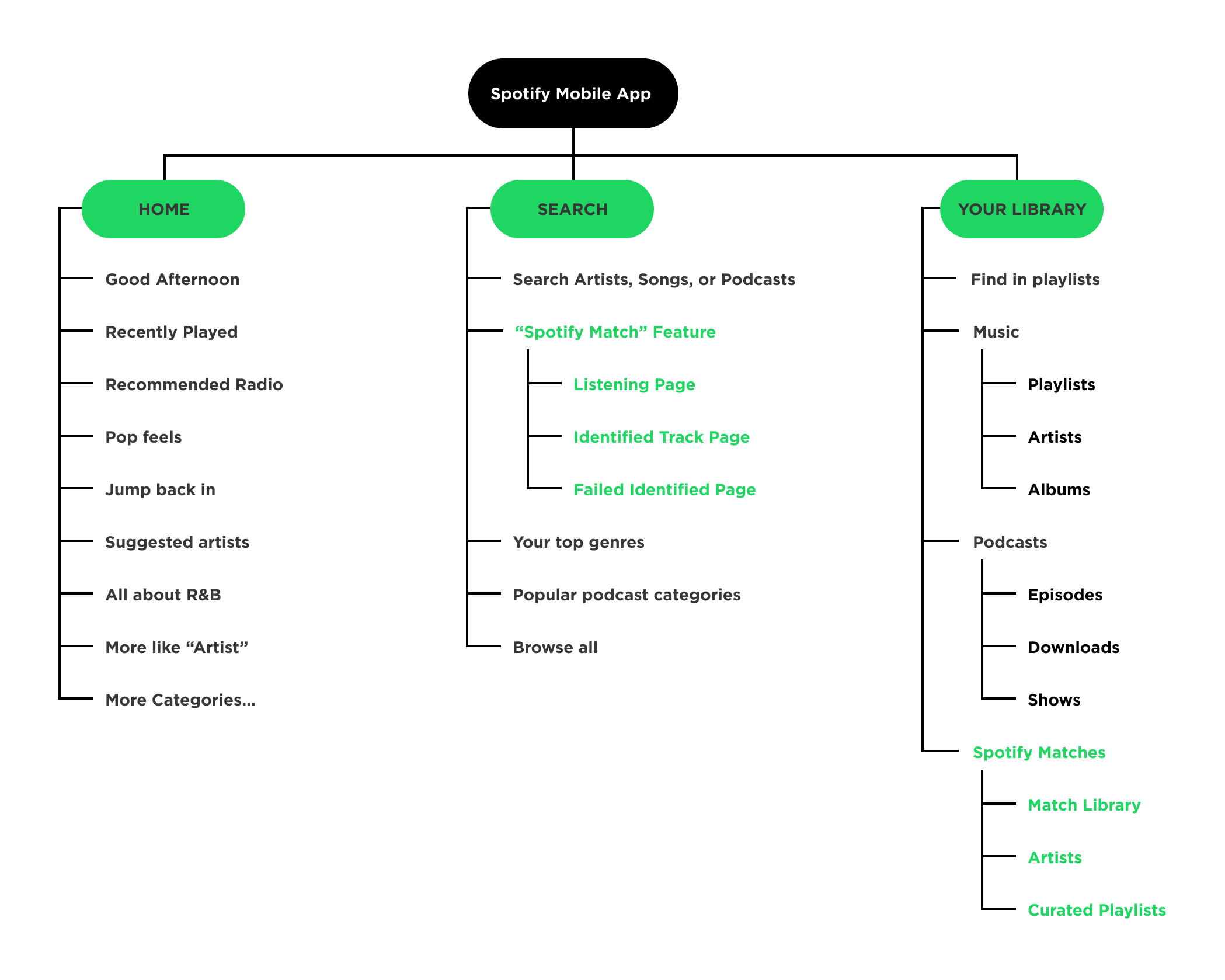 After looking at the competitive analysis and market research, I created a site map of the existing Spotify app to show proposed screen pages while including the new feature.